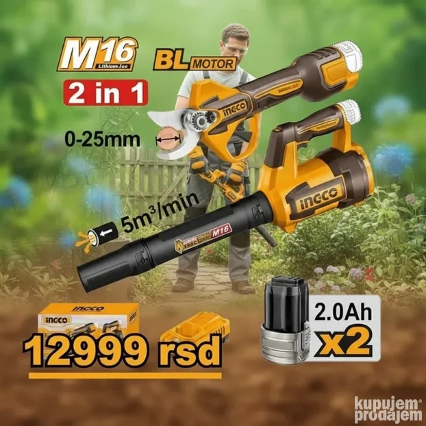 Ingco Aku set 2/1 16V COSLI250385E Super Ingco - obuhvata duvač lišća, makaze za orezivanje, dve baterije od 2Ah i punjač.