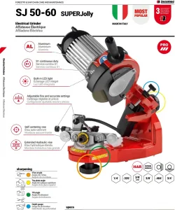 Profesionalni električni oštrač lanca SUPER JOLLY Tecomec 11509004 je stolni uređaj sa poluautomatskim hidrauličnim sistemom stezanja koji značajno ubrzava proces oštrenja u odnosu na klasične manuelne modele. Dizajniran za servise, šumarske kompanije i komercijalne radionice koje dnevno oštri veći broj lanaca. Hidraulično stezanje automatski fiksira lanac na tri tačke prilikom spuštanja glave brusilice, što eliminiše potrebu za ručnim zatezanjem nakon svakog zuba i skraćuje vreme rada za približno 50%.