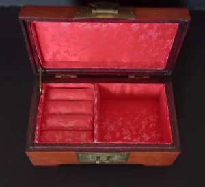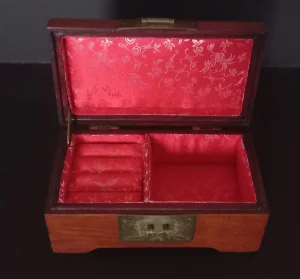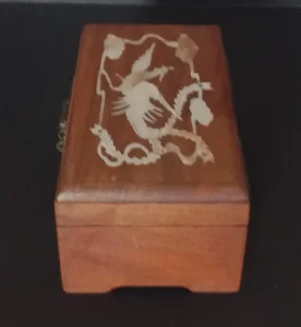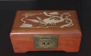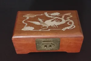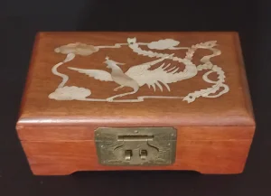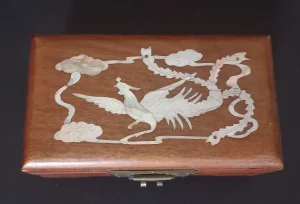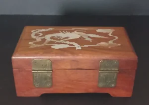 Stara kutija za nakit od prirodnog drveta i Sedefa u obliku Zmaja na poklopcu kutije.