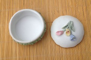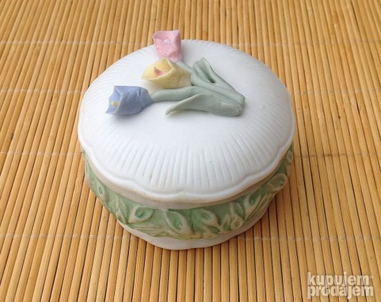 Original. Made in ITALY. NOVO! Collezione Galileo vintage mala porcelanska kutija. Ova kutija potiče iz osamdesetih godina prošlog veka, dakle prilično je stara, ali je sve vreme stajala odložena i zaštićena - nije nikada korišćena. Napravljena je od porcelana, ukrašena sa lalalama u tri boje: plava , roze i žuta, zelenim lišćem i dekoracijama. Dimenzijekutije su cca: prečnik 8 cm; visina 6 cm. Cveće izgleda poput onog koje se može videti na komadima porculana Capo di Monte. Savršeno dobro očuvan komad bez oštećenja (još jednom - NOV! )