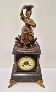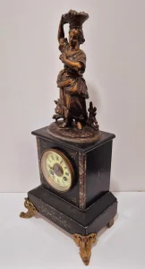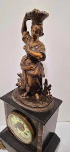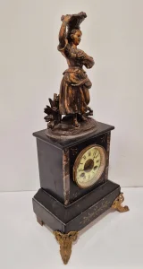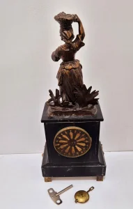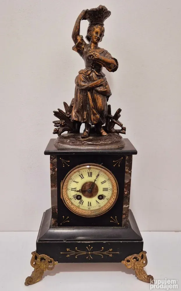 Prelep stari kaminski sat od mermera sa bronzanom figurom