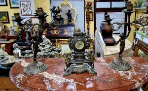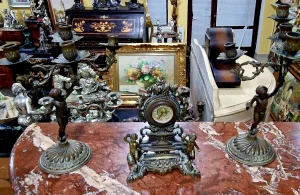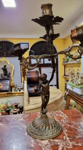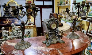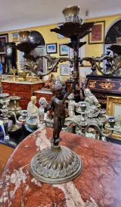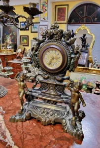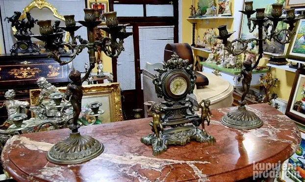 Prelep stari mesingani komodni sat sa velikim svecnjacima