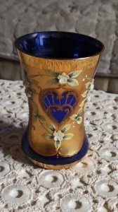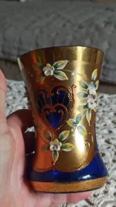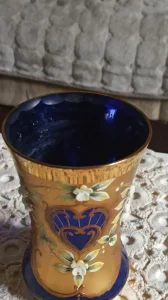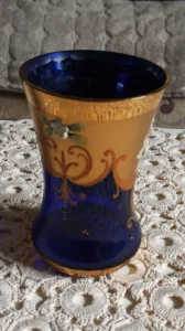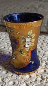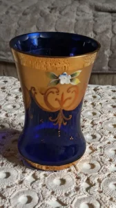Bohemia kobalt plava vaza sa pozlatom od 24-karstnog zlata i sa cvetnim reljefnim ukrasima od porcelana.