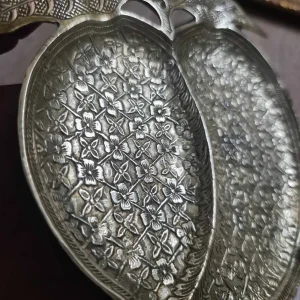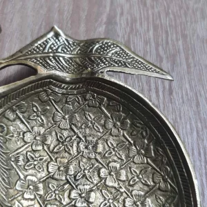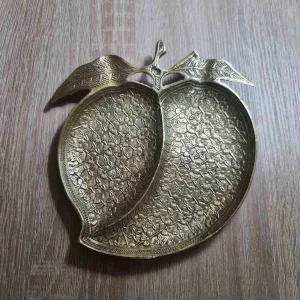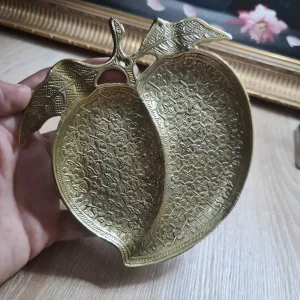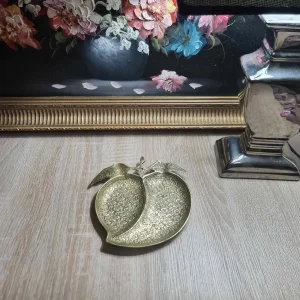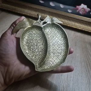 Dekorativna mesingana pepeljara u obliku breskve sa dva odeljka i bogatim ručnim gravurama cveća i listova.