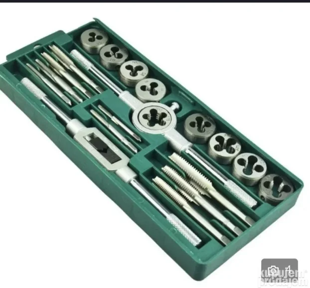 Opis: Set za pravljenje i popravku navoja (20 delova). Sadrži: 9 slavina, 9 nareznica, držač za slavine, držač za nareznice. Veličine: M3 do M12 (metrički navoj). Upotreba: za metal i plastiku, za pravljenje unutrašnjih i spoljašnjih navoja.
