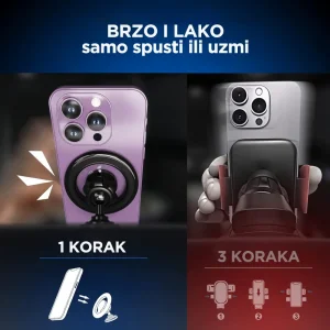 2-U-1 MAGNETNI DRŽAČ ZA VENTILACIJU I KONTROLNU TABLU Univerzalni 360° rotirajući magnetni držač u automobilu • Elegantan, kompaktan i ultra siguran • Sa dva nastavka - Pogodno za upotrebu na instrument tabli i ventilaciji • MagSafe kompatibilan • Kompatibilan sa svim telefonima, tabletima i GPS uređajima • Model: TC-01