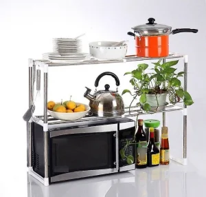 Мултифункционални сталак за микроталасну пећницу од нерђајућег челика за домаћинство Телескопски лонац за складиштење Полица за одлагање стојећи тип двослојни | зидни кухињски регалиОписОвај сталак за микроталасну пећницу усваја врхунске композитне цеви од нерђајућег челика и АБС конекторе, који се не могу лако старети, бледе. Једноставан за инсталацију, двослојни дизајн, јака и издржљива, моћна функција, циљ је да се у потпуности искористи кухињски простор и све се организује. Карактеристике- Боја: Као што је приказано. - Материјал: нерђајући челик и АБС. - Величина: 47,5 к 24,5 к 64. - Композитне цеви од нерђајућег челика и АБС конектори, јаки и издржљиви. - Флексибилни телескопски дизајн, испуњавају више захтева за складиштење, штеде много простора у соби. - Може се широко користити за складиштење кухињског прибора, микроталасних пећница, боца и лименки. - Мале куке са обе стране за удобност вашег пешкира, крпе за суђе, кавез за висеће штапиће за јело, лопатица и други мали предмети. - Користан додатак сваком животном или складишном простору, додајући више простора.
