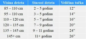 Ukoliko niste sigurni koja veličina odgovara Vašem detetu, pogledajte poslednju sliku i lako odredite optimalnu dimenziju točka za dati uzrast i visinu deteta.