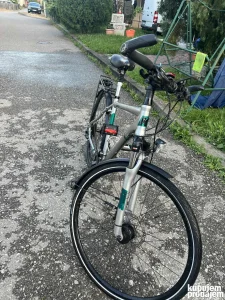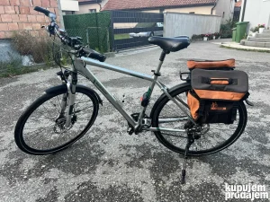 Prodajem muski bicikl Kalkhoff Voyager DLX, bicikl je kod mene par godina, u dobrom stanju, odlicno ocuvan, sve fabricko na njemu. Uz njega idu bisage, Sigma digitalni merac i Ergon GP 4 drske sa rogovima. Na njemu fabricka dinama sa AXA Pico30 led svetlima, Schwalbe Citizen gume. Oprema je Shimano Deore. Prednji amortizer ima zakljucavanje, sediste ima svoj amortizer. Svetla imaju rezervu od par minuta, sijaju nakon zaustavljanja. Uz bicikl ide i alarm na daljinski koji moze ujedno da bude i sirena i dodatno svetlo.