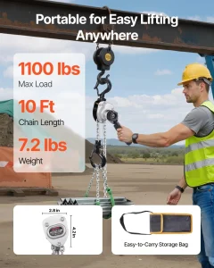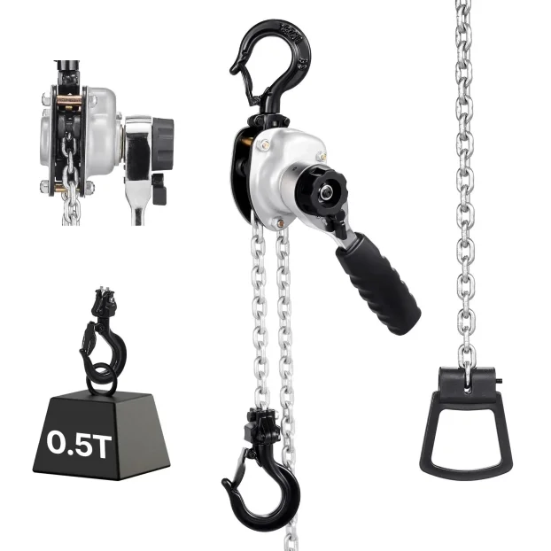 Ručna polugasta dizalica sa lancem, nosivost 1/2 T / 500 kg, teška poluga, visina podizanja 3 m, lanac od legiranog čelika G80 sa dvostrukom mehaničkom kočnicom, kuke koje se rotiraju 360° , za skladišta, gradilišta i garaže.