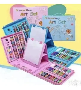 Vrhnski set za mladog umetnika sa štafelajem od 208 predmeta. U kompletu ćete pronaći sve što Vam je potrebno za „ šarenu kreativnost“ : štafelaj, boje, bojice, olovke, flomastere različitih veličina i drugi sitni pribor (lenjir, oštrač, itd. ) Svi predmeti se skupljaju u posebni kofer koji se lako rasklapa i pretvara u štafelaj.