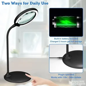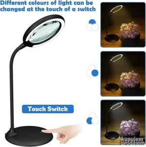 Touch LED rasveta – Lupa sa svetlom koristi touch prekidač koji je praktičniji od klasičnih tastera. Prekidač je smešten blizu sočiva, pa se lako uključuje i isključuje. Dugim pritiskom podešavate jačinu osvetljenja od 10% do 100%. Na fleksibilnom vratu nalazi se 28 LED dioda, snažnih i dugotrajnijih. Lupa pruža uvećanje 3x.