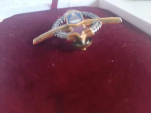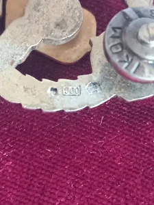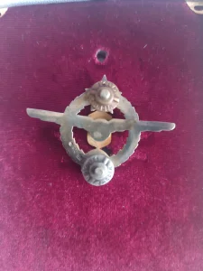 - Značka je napravljena od srebra i mesinga sa detaljima od crvenog i plavog emajla.