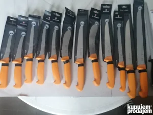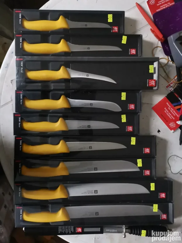 Nozevi Nemački Zwiling zvani Blizanci za svakodnevno koriscenje u domacinstvu i mesnoj industriji, secivo kaljeno u ledu, tvrdoca 57 HRC, zuta ergonomska drska od sinteticke smole, razlicitih dimenzija od 13cm do 30cm: