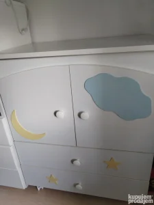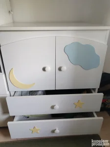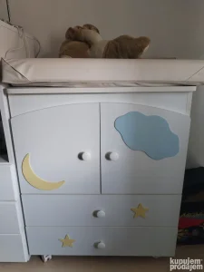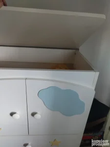 Komoda malo korišćena sa dve fioke. Gornji deo se otvara može da se montira kadica za kupanje, mi je nismo imali. Na poklon podloga za presvlačenje sa zadnje slike.