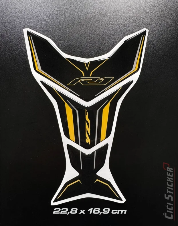 Izrađen je od visokokvalitetnog poliuretanskog (gel) materijala koji obezbeđuje dugotrajnost, sjajan 3D efekat i otpornost na UV zrake, vlagu i hemikalije. Elegantna crno-zlatna kombinacija daje motoru luksuzan i sportski izgled, savršeno uklapajući se uz liniju Yamaha R1.