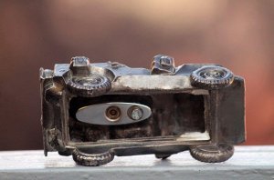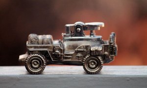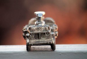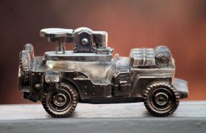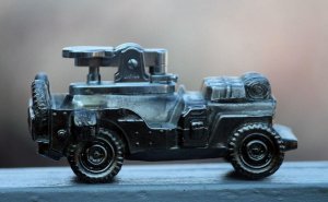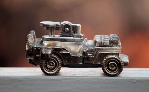 Made in JAPAN. Vintage metalni upaljač u obliku veoma precizno prikazenog modela vojnog džipa, sa svim detaljima (prtljag, dve rezervne gume, šatorska krila, maskirna mreža, bisage itd itd. ) Ovaj veoma zanimljivi i retki upaljač - figura napravljen je u Japanu u pedesetim ili šezdesetim godinama i označen je na strani mehanizma "JAPAN". Automobil je vrlo detaljan, a meri 97 mm, širok je 53 mm", i visok 52 mm. Mehanizam je dosta lakši, stoji na vrhu i lako se izvlači sa svog mesta za punjenje goriva. U upalajču trenutno nema ni goriva ni kremena.