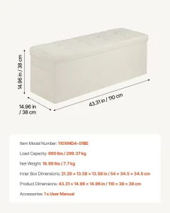 Izrađena od lanene tkanine otpornе na mrlje, ova otoman klupa sa skladišnim prostorom ima jastuk od visokogustinske pene debljine 2,5 cm / 0,98 inča, koji pruža meku i udobnu potporu. Poklopac sa preklopom omogućava lako otvaranje, dok neklizajuće podloge osiguravaju stabilnost na glatkim površinama.