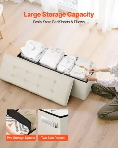 Sklopiva otoman klupa sa prostorom za odlaganje, klupa za kraj kreveta sa bočnim džepovima, tapacirani sklopivi kovčeg, nosivost do 300 kg, lanena otoman klupa sa velikim prostorom za dnevnu sobu, spavaću sobu i predsoblje, bež.