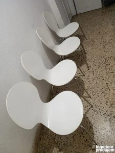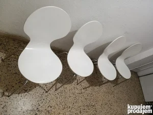 Na prodaju je set od četiri (4) moderne dizajnerske stolice u beloj boji. Stolice su idealne za trpezariju, kuhinju, kancelarije, čekaonice ili ugostiteljske objekte. Njihov jedinstven, zakrivljen i ergonomičan oblik sedalnog dela (podsećaju na G-stolicu ili Ant Chair stil) odlično se uklapa u savremene enterijere.