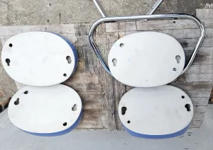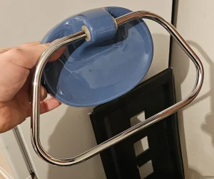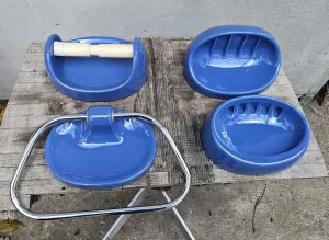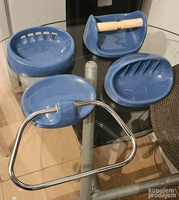 Sjajan "space age"komlet za kupatilo od četiri držača iz 1970/80 ih godina u odličnom stanju. Boja bliže odgovara onim fotografijama koje su uslikane u kući (1-7) tamnije plava, ove slike napolju dosta variraju zbog efekta dnevnog svetla. Možda je zato i najbolje da ih lično pogledate pre eventualne kupovine ako vam je nijansa boje presudna. Komplet sadrži držače za sapun, četkice, peškir, i toalet papir. Cena je za ceo komplet, ne prodajem pojedinačno. Fiksno