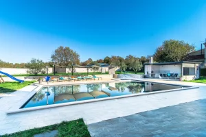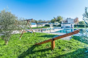 Napolju vas čeka impresivan bazen dimenzija 12x6 m, okružen ležaljkama i natkrivenim prostorom za obedovanje. Pored bazena se nalazi letnja kuhinja sa roštiljem, idealna za večeri pod vedrim nebom uz čašu istarskog vina. Za najmlađe, vila nudi dečje igralište sa ljuljaškom, klackalicom, toboganom i trampolinom.