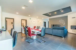 Centralni deo vile zauzima svetao open-space koncept koji objedinjuje potpuno opremljenu kuhinju, trpezariju i dnevni boravak sa udobnim sofama, od kojih se jedna pretvara u dodatni ležaj za dve osobe. Velike staklene klizne površine otvaraju se ka prostranoj terasi i vrtu, pružajući neometan pogled na privatni bazen i zelenilo.
