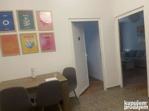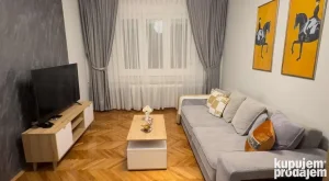 Trosoban stan sredjen , potpuno namesten, tri posebne sobe, terasa, podrum. Grejanje centralno, nova inverter klima grin. Kod ministarstva finansija. Pogodan za porodicu ali i za poslovni prostor.