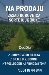 Na prodaju je kompletno opremljen i redovno održavan zasad borovnice sorte Djuk (Duke), poznate po visokom kvalitetu ploda i stabilnim prinosima.