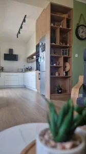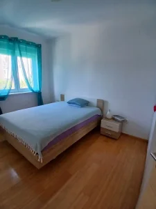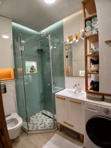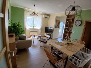 Struktura stana: ulazni hodnik iz kojeg se ulazi u dnevni boravak i mali wc (slika sa belim okruglim ogledalom) tu je sklonjen i bojler. Dnevna soba sa kuhinjom i velikim izlazom na terasu. Iz dnevne sobe se ulazi u još jedan hodnik koji vodi do dve spavaće sobe i kupatila. A u kojem se nalazi veliki ugradni orman.
