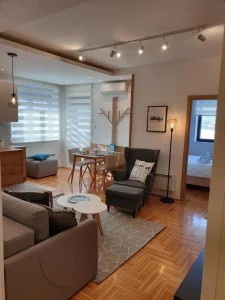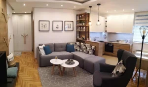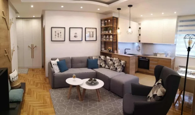 Apartman je kompletno opremljen nameštajem po meri, 2TV-a, frižider, rerna, indukcioni ploča, aspirator, mašina za suđe, sitni aparati.