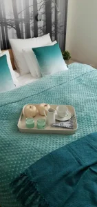 Set posteljina za četiri osobe, prostirke, peškiri sve dekoracije.