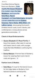 Autenticni prikaz boje na prve dve slike. Na poslednje dve slike mozete videti neke od poznatih licnosti koje su nosile ili i dalje nose Burberry brend.