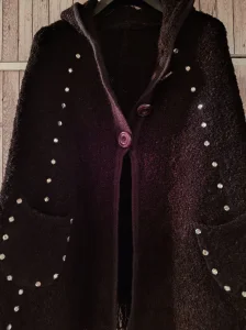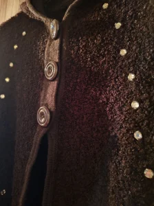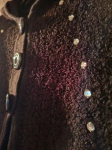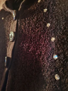 Kopčanje sa 3 velika dugmeta, a ukrašen je sjajnim, "kristalnim" kamenčićima, koji su veoma dobro učvršćeni za materijal.