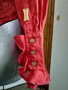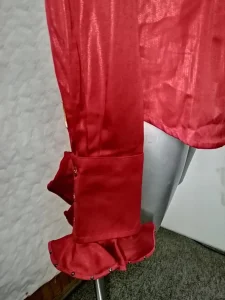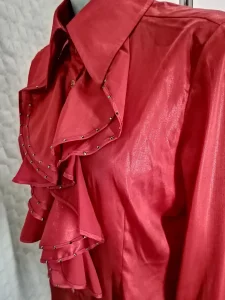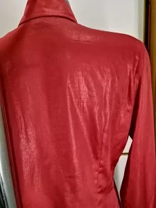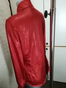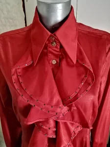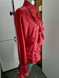 SOCIETA zenska kosulja sa velikim karnerima i crnim cirkonima, na klasicno kopcanje sa metelno zlatnim dugmadima, boja crvena, materijal: 100% viskoza rayon, tanka, velicina 46 italijanski, nas 42 broj. Veoma elegantna, prelepa i zanimljiva kosulja, extra izgled uzivo, kao sto se moze videti na prikazanim slikama. NOVO, nikad korisceno, ali nema etiketu. Cena: 10000 rsd.