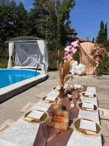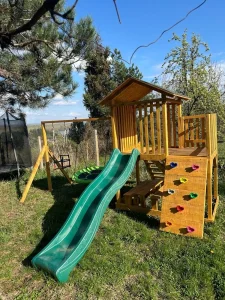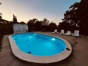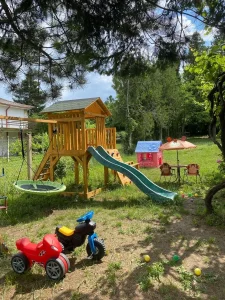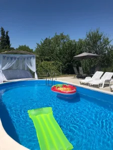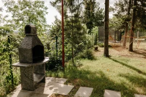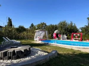 Prostrano dvorište prilagođeno je i odraslima i mališanima! Gosti mogu uživati u bazenu dimenzija 8x4 m i dubine 1,5 m, savršenim za osveženje tokom toplih dana. Ljubitelji aktivnog odmora imaju na raspolaganju sto za stoni tenis, pikado i ozidan roštilj za pripremu gurmanskih specijaliteta. Najmlađima je posvećen poseban kutak sa igraonicom na otvorenom, koja uključuje ljuljaške, tobogan, kućicu za igru i mrežu za penjanje, tako da je ovo savršeno mesto za proslavu dečijih rođendana.