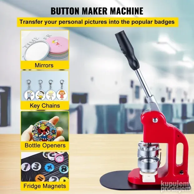 Specifikacije Veličina matrice: 1,73 in / 44 mm Veličina dugmeta: 1,73 in / 44 mm Količina dugmadi: 1000 kompleta Veličina baze: 6,3 x 11,4 in / 16 x 29 cm Dužina ručke: 11,81 in / 30 cm Dužina paketa: 17,32 in / 44 cm Širina paketa: 11,81 in / 30 cm Visina pakovanja: 11,81 in / 30 cm Bruto težina: 29,4 lbs / 13,32 kg VEVOR 44mm Mašina za pravljenje dugmadi 1,73 Mašina za pravljenje dugmadi i značaka Mašina za pravljenje dugmadi sa 1000 dugmadi (1000 kom) Sadržaj paketa 1 x Dugmad Maker 1 x Set kalupa 44 mm Dugmad 1000 k 44 mm (metalni delovi + plastični delovi + prozirni poklopci) 2 x šesterokutni ključevi 2 x Dovels 2 x zavrtnji 2 x podloške 1 x plastični rezač papira 1 x priručnik