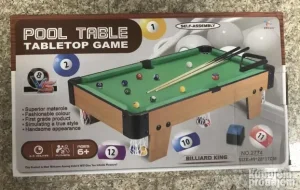 Set sadrži: bilijarski sto, 16 kuglica, 2 štapa, 1 kredu i trougao.