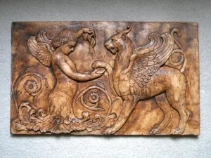Reljef `Nimfa i Grifon` je radjen po motivu reljefa iz antickog Rima. Prikazuje scenu kada šumska Nimfa leči šapu Grifonu.