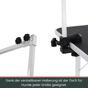 Podesiva visina sa držačem i omčom – čvrsta ruka stola obezbeđuje sigurno držanje tokom šišanja, češljanja ili sušenja. Podesiva visina pruža udobnost i za male i za velike pse.