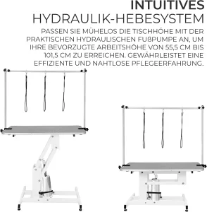 Hidraulični sistem podizanja: Lako prilagodite svoj radni položaj pomoću hidrauličnog poluge. Omogućava jednostavno podešavanje visine stola od 55,5 cm do 101,5 cm, kako biste postigli željenu visinu za rad. Ovo obezbeđuje udobnost i efikasnost tokom šišanja i nege.