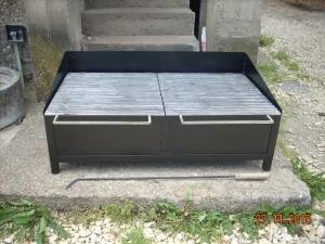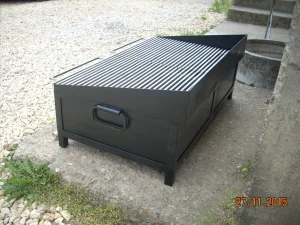 Okvir rostilja je napravljen od L - Profila 30x30 . Kutija je od debljeg lima 2 mm otpornog na toplotu. Resetka je napravljena od Prohromskog firiketa 8x8mm debljine i na sarkama je postavljena. Okvir rostilja je ofarban vatrostalnom bojom! Uz rostilj dobijate Dzarac za zar.