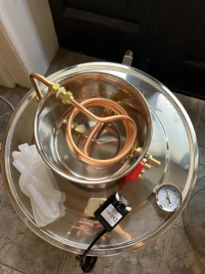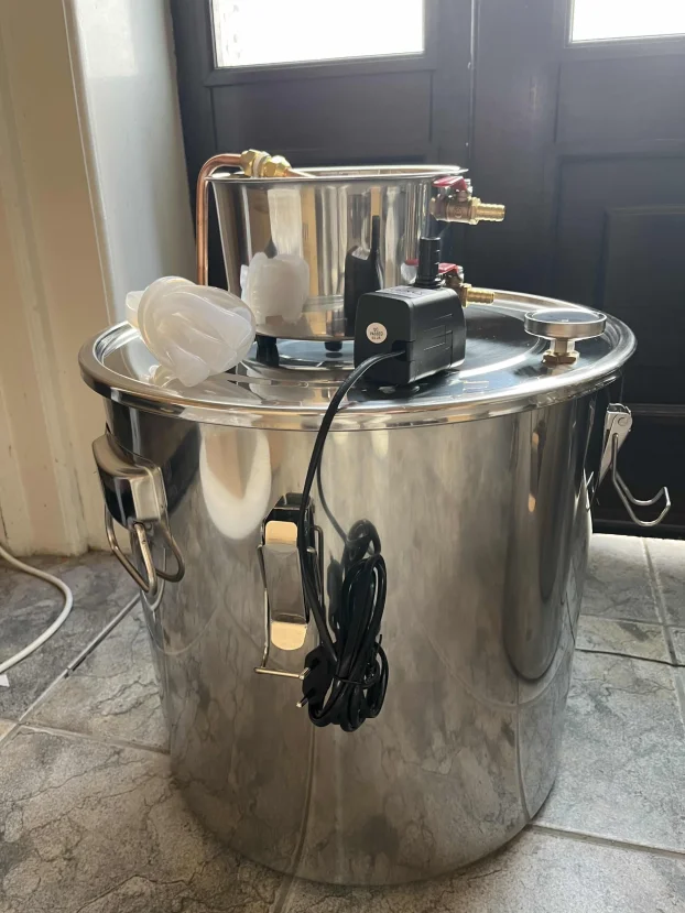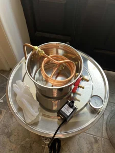 Ovaj aparat za destilaciju ima kapacitet od 50 litara (kazan 40×40 cm, kondenzator 20×12 cm) i izrađen je od nerđajućeg čelika, bakra i silikona bezbednog za hranu.
